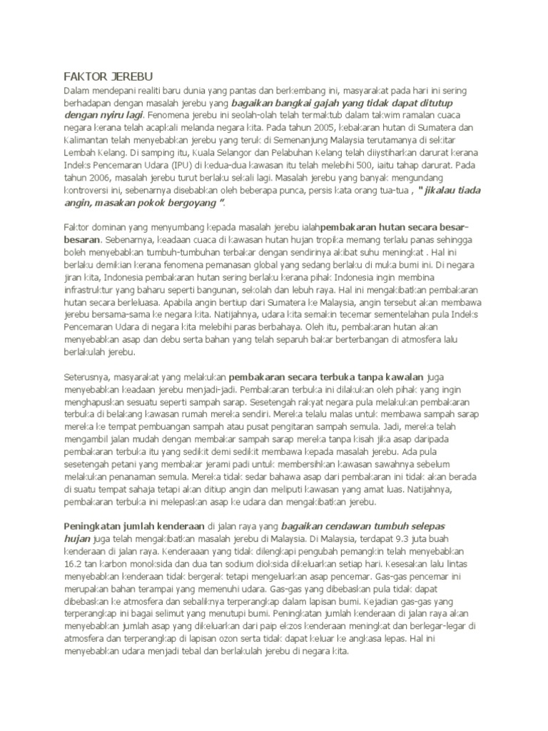 Keadaan jerebu menyebabkan manusia menghidap pelbagai penyakit seperti sesak nafas selesema batuk dan pedih mata. Masalah jerebu yang banyak mengundang kontroversi ini sebenarnya disebabkan oleh beberapa punca persis kata orang tua-tua jikalau tiada angin masakan pokok bergoyang. Contoh Karangan FAKTOR JEREBU Dalam mendepani realiti baru dunia yang pantas dan berkembang ini masyarakat pada hari ini sering berhadapan dengan masalah jerebu yang bagaikan bangkai gajah yang tidak dapat ditutup dengan nyiru lagi.